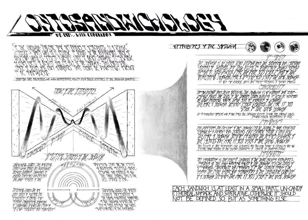 In The Sandwich Guide: a Georomantic Essay through the Ethereal Un-candy, the sandwich is an excuse to talk about anything that’s not a sandwich. It is an overcomplicating and contradictory discourse on different registers, such as critical theory, logical mysticism, fanzine, cooking manual and non-fictional comics.